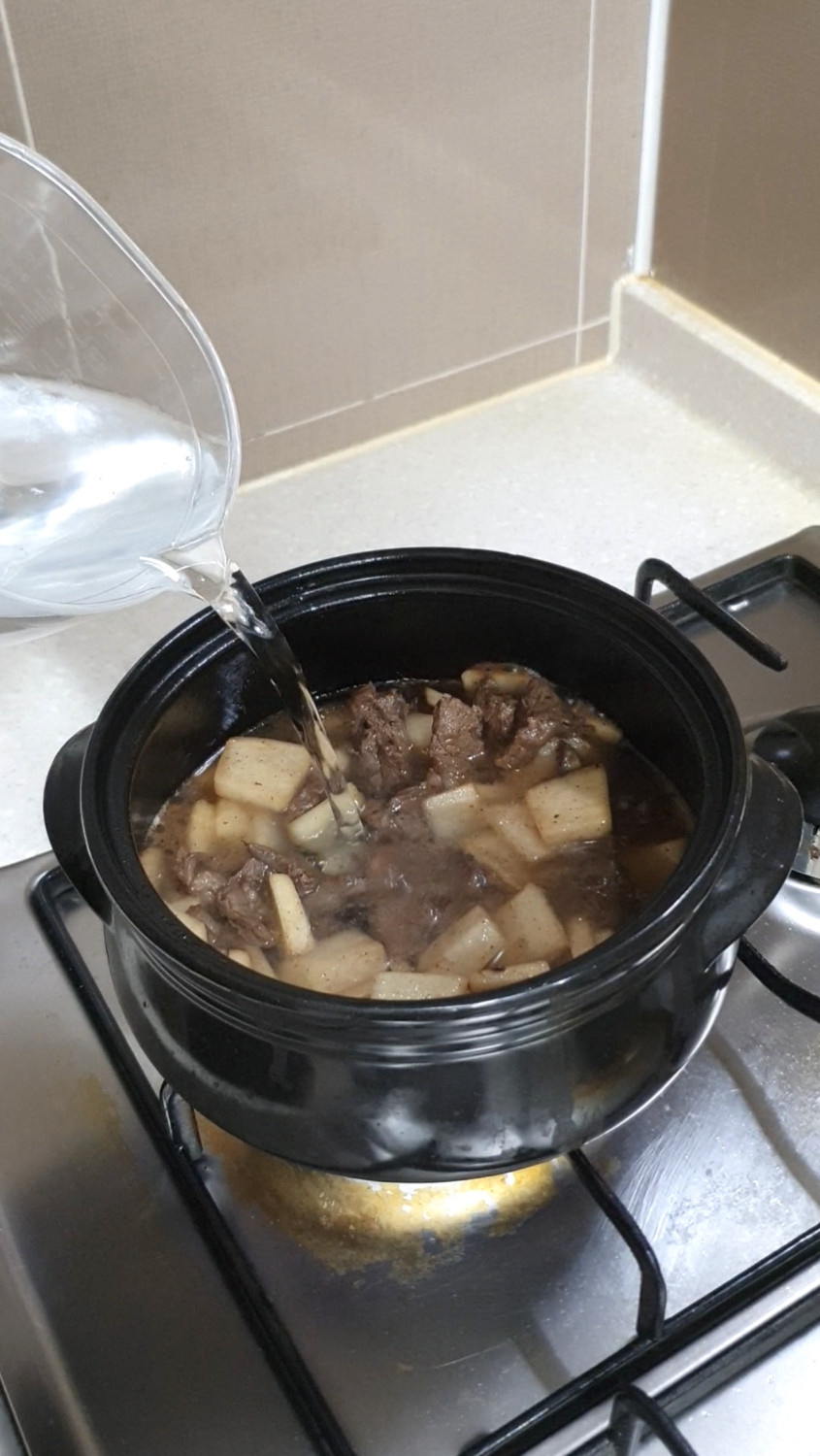 소고기를 볶은 후 무를 넣습니다.