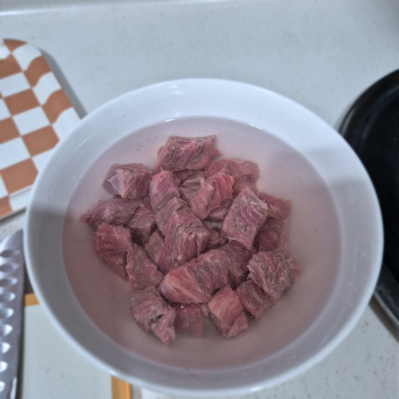 소고기를 찬물에 20~30분 정도 담가 핏물을 제거합니다.
